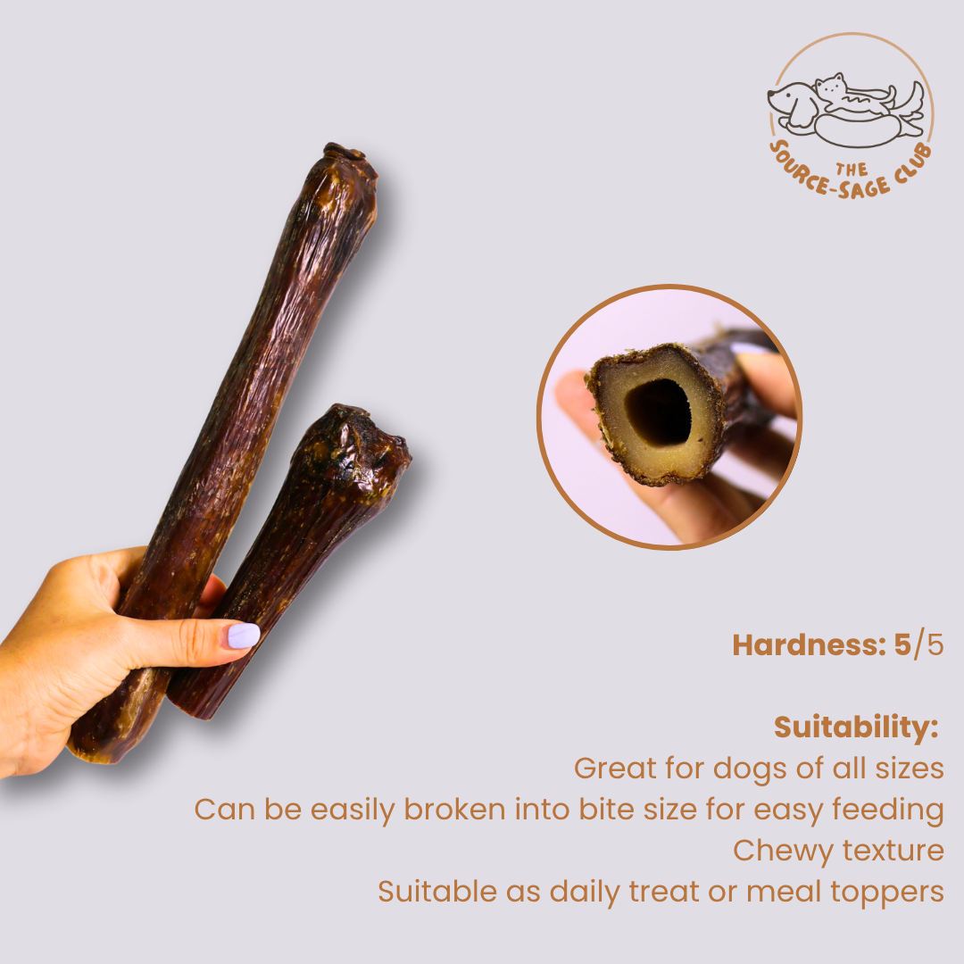 The venison bone and beef weasand are from New Zealand farm raised Venison & beef. No fillers, no additives, no complicated ingredients. Just all-natural Beef Weasand and Venison Shank Bone gently air-dried to perfection.
